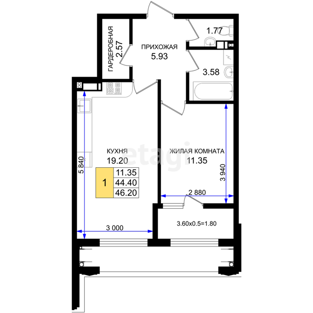 1 - комн. квартира | 46.2 м² | 2/8эт.